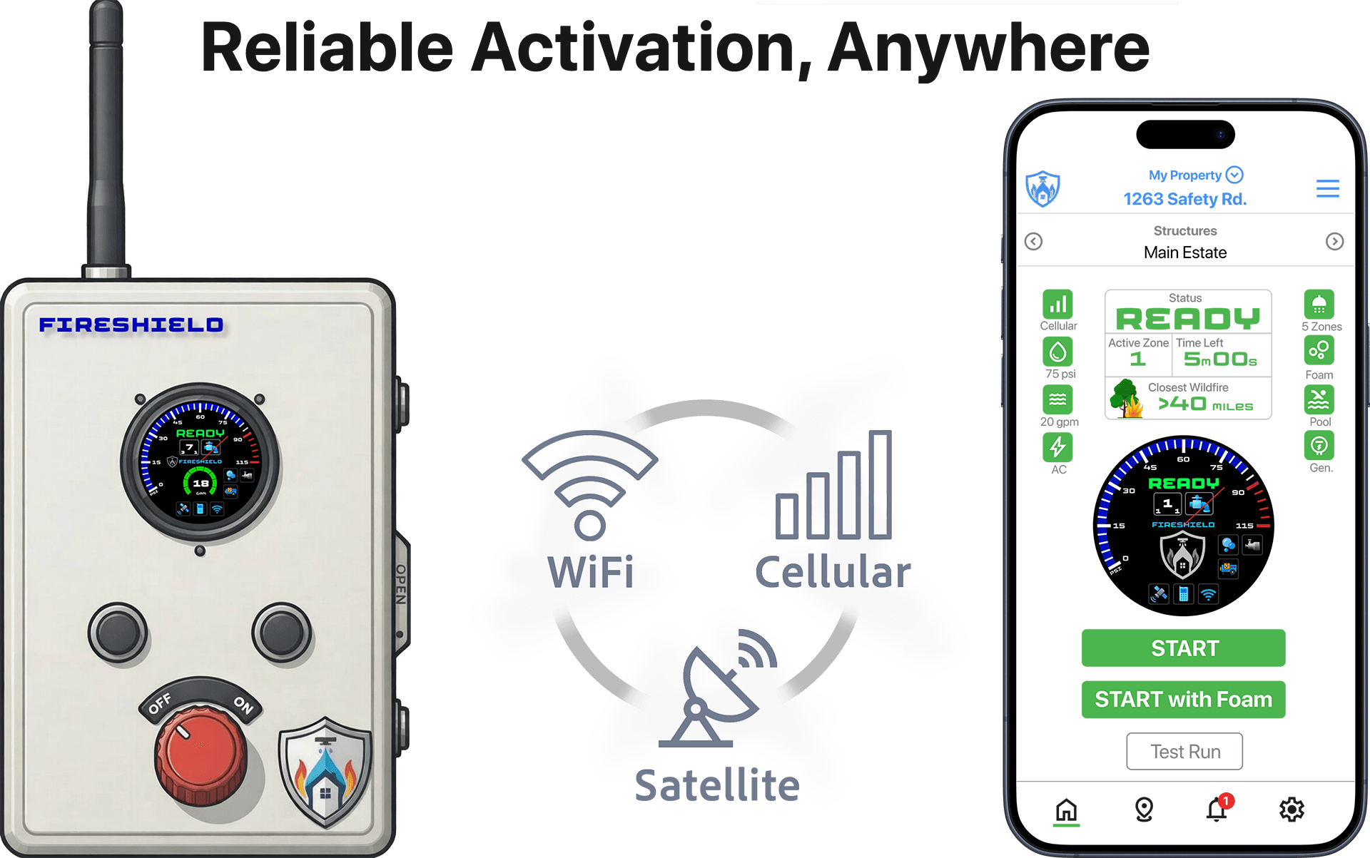 FireShield includes backup battery power, optional generator support, and the ability to automatically switch to water from pools or storage tanks—helping maintain protection even if local services are disrupted. With satellite, cellular, and WiFi, connectivity, you can monitor and manage your system from virtually anywhere.