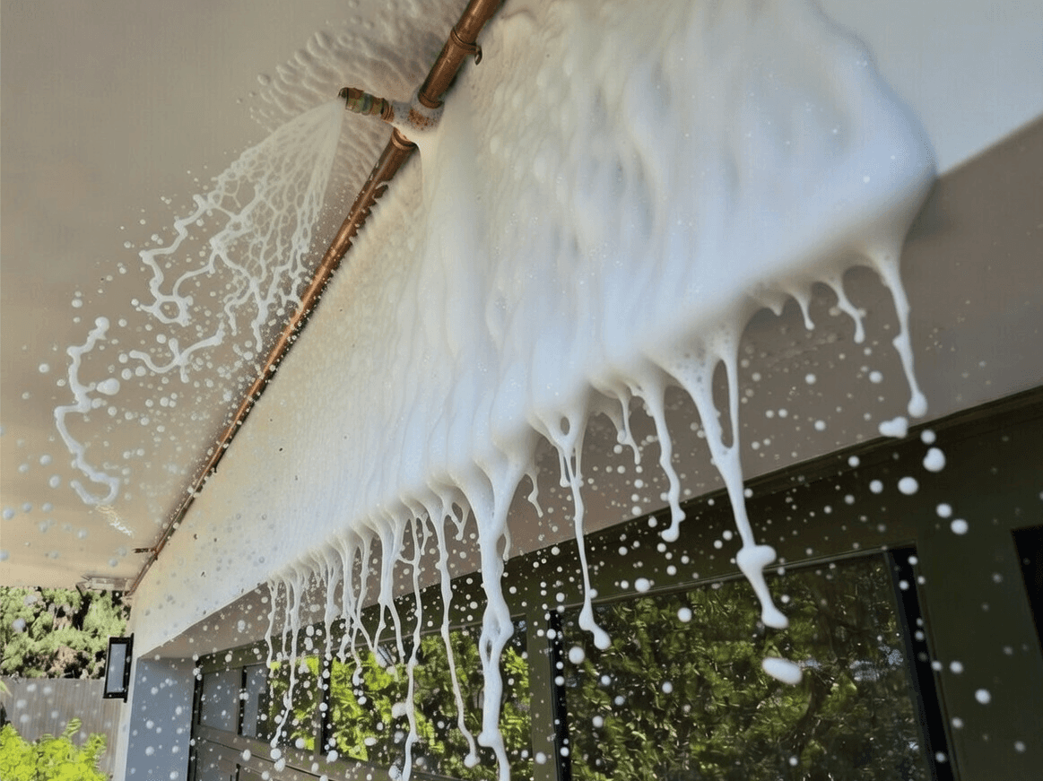 FireShield applies non-toxic, U.S. Forest Service–approved, biodegradable Class A foam that improves water absorption on exterior surfaces. The foam clings longer than water alone and rinses away cleanly after application.